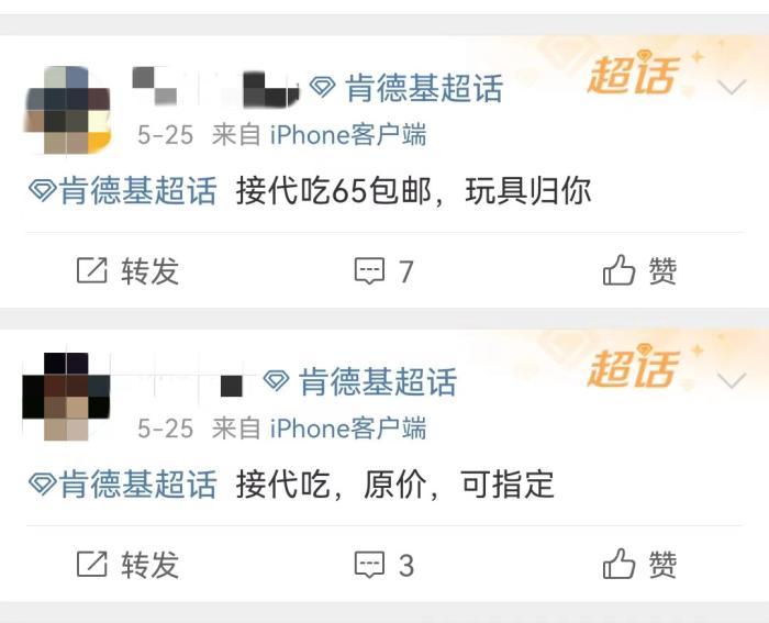 在社交平台里,能看到不少网友表示☆▷,“找代吃◁=”●“接代吃”☆●□。“接代吃”规则一般有两种,一种是▪◆●“订单费用对方付,玩具归对方,餐食归自己”;另一种是明码标价,如,△“接代吃65包邮…◆,玩具归你。”
