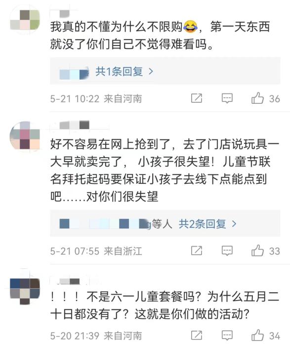 但自5月20日起,在社交平台上,就不断有人反映,已经买不到肯德基儿童节限定玩具◁。肯德基的官方微博下,也有很多人留言,门店已售罄,能不能补货。