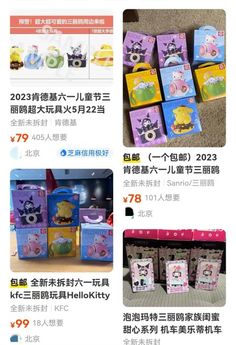 在某二手平台,肯德基此次发售的三丽鸥玩具-□-,标价集中在70元至100元之间◇,比69•●.9元的儿童节套餐价格更贵。麦当劳俄罗斯方块游戏机的价格多在40元至60元之间。